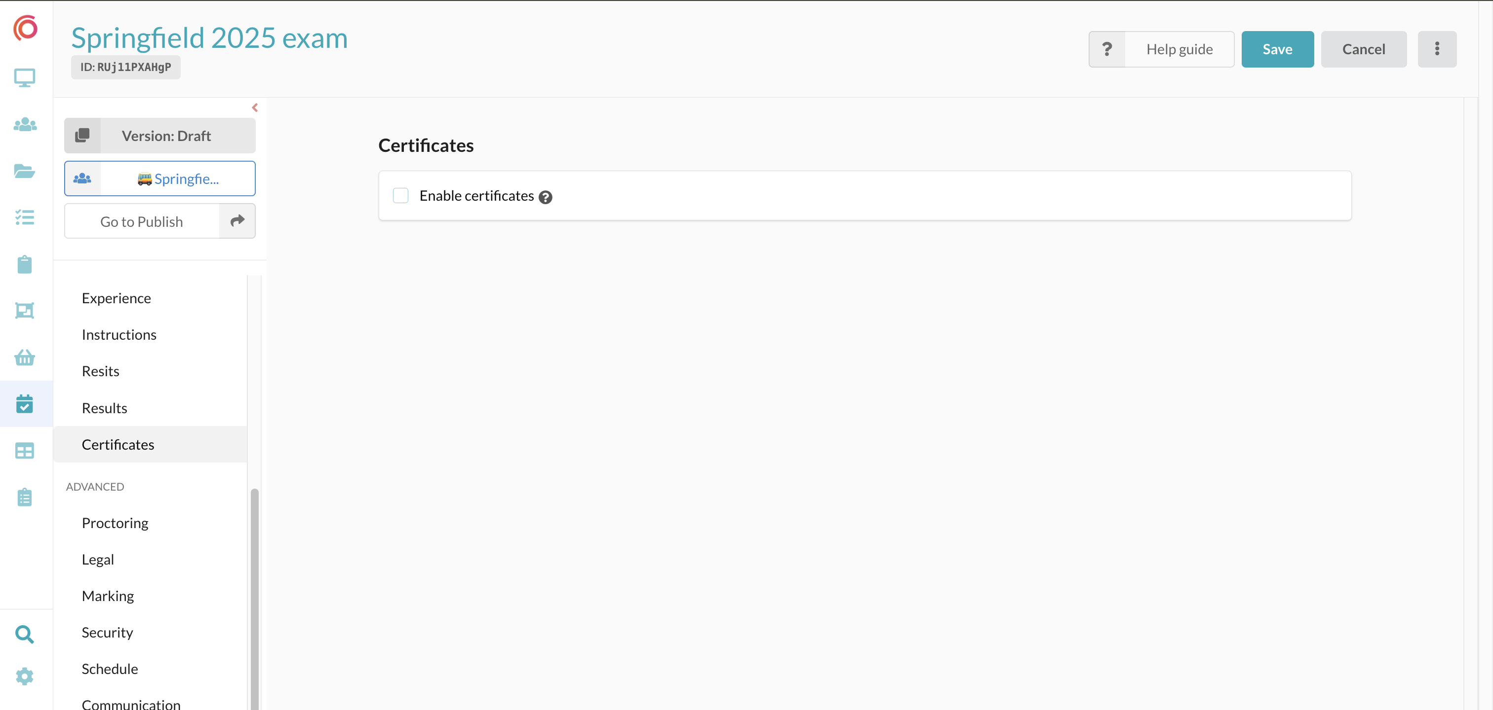 On an exam that has grades set up, navigate to certificates via the exams sub menu and select **Enable certificates.**&#x20;