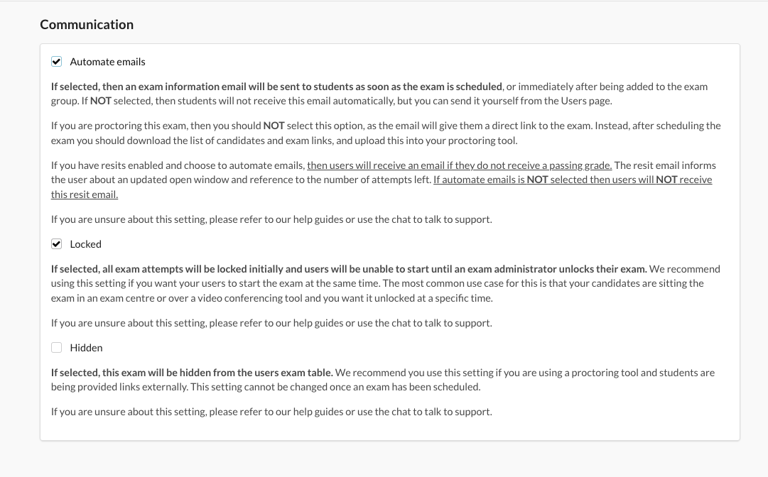 **Automated Emails:** Send out automated exam emails to candidates, this can be set during the set up or you can come back to it later. Exam emails will send as soon as the exam is scheduled. Students will get their exam link however won't be able to start the exam until the exam window is open (see below)&#x20;