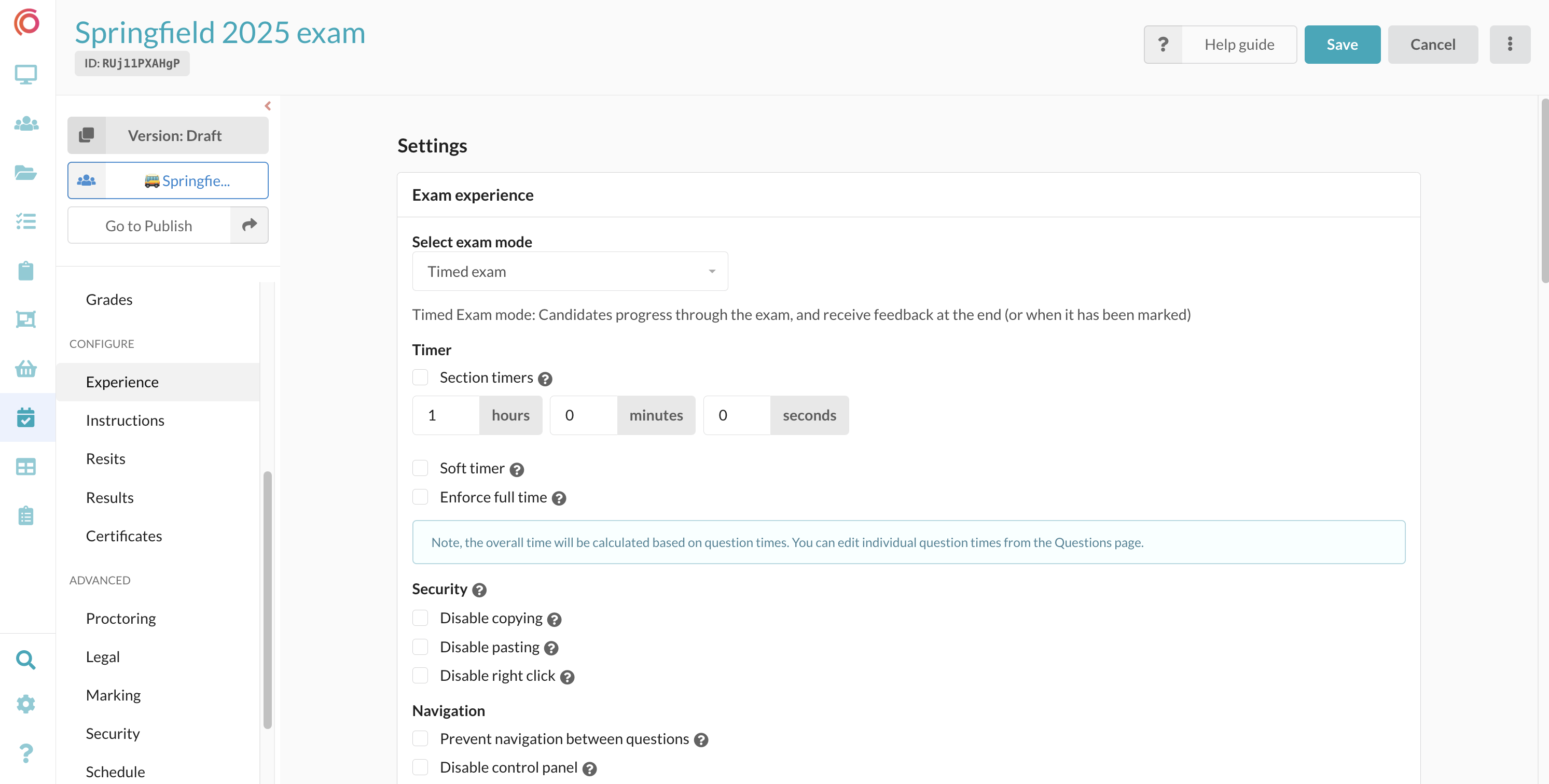 **Timer** : For timed exams then the time set here is the duration of the exam once a student has started.