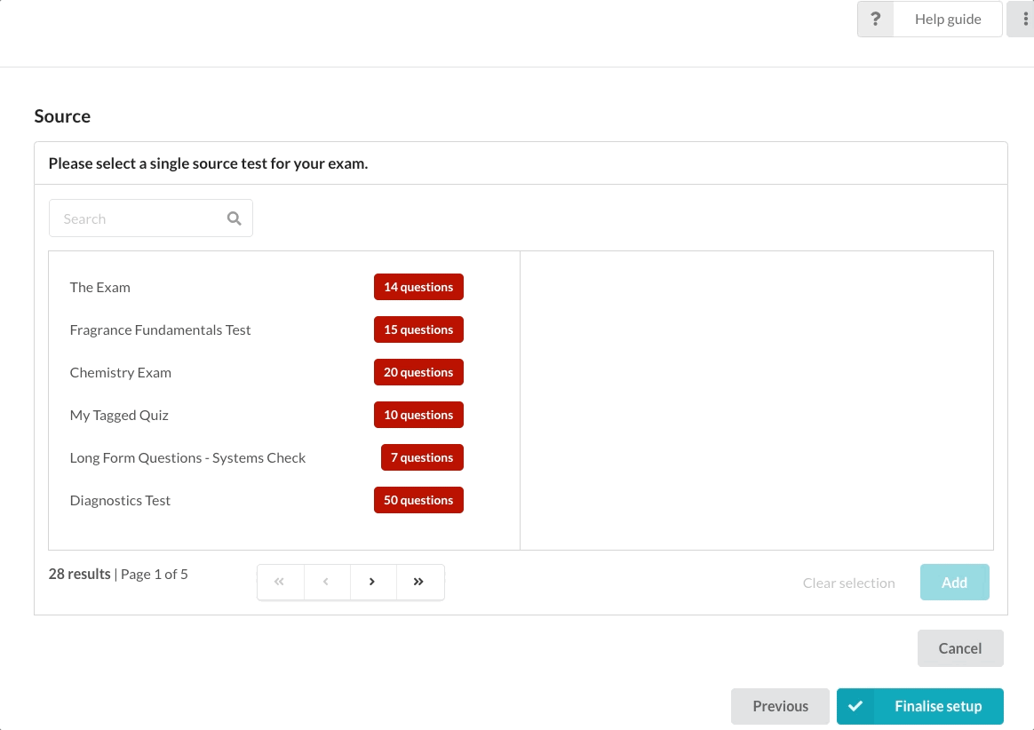 Search for and select a source quiz from your library for your exam. When you've made your selection hit 'Next' where you'll be shown a summary of that quiz, name and tags. Check this is correct, if its not you can go back a step to swap the quiz.