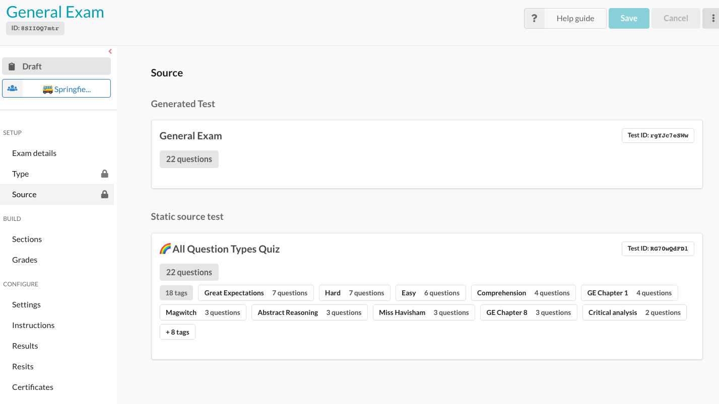 Once your exam set up has been finalised you'll be moved onto the next part of the creation process : **BUILD**, to modify sections or grades that have been pulled from your source quiz.