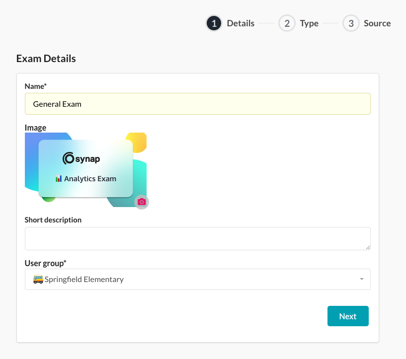 Give your exam a name and select a user group to set it to. You can also give your exam an option internal short description and image. Once done, save and go onto the next step