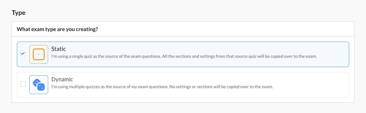 Select the type exam you want, there are some extra steps involved if you pick dynamic so be sure to check out our docs below!