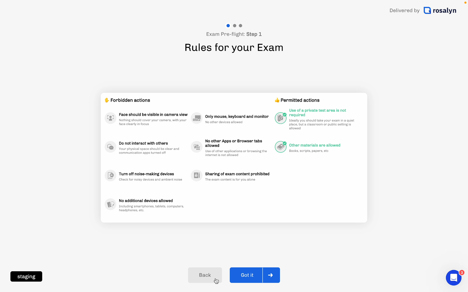 <figure><img src="https://3316915154-files.gitbook.io/~/files/v0/b/gitbook-x-prod.appspot.com/o/spaces%2F-MkgvUeCmTPeNouRxGPC%2Fuploads%2Fvc74QCqT1igtdZPLnr3O%2Fimage.png?alt=media&#x26;token=4fe4dd22-9a22-42f4-ad6c-e78304b7cc05" alt=""><figcaption><p>Exam rules during Rosalyn set-up</p></figcaption></figure>