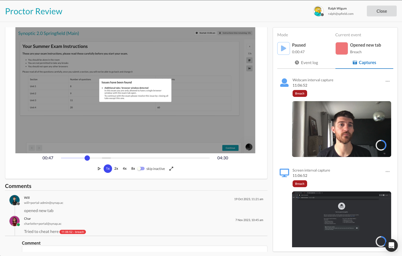 On the attempt proctoring review page you'll be able to view the different recordings and captures through out the attempt, leave comments, and jump to the different events and breaches of the candidate.