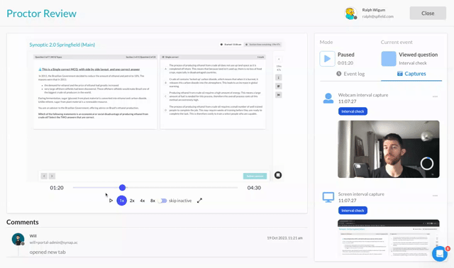 <figure><img src="https://3316915154-files.gitbook.io/~/files/v0/b/gitbook-x-prod.appspot.com/o/spaces%2F-MkgvUeCmTPeNouRxGPC%2Fuploads%2FWJqDyLQhCL9tv0qngsrx%2FProctor%20Review%20_%20Proctor%20Review%20_%20Synoptic%202.0%20Springfield%20(Main)%20_%20Synap%20Portal.gif?alt=media&#x26;token=41d9f670-56bb-46b6-b2bd-9d2da5e8f732" alt=""><figcaption><p>Reviewing a proctoring session</p></figcaption></figure>