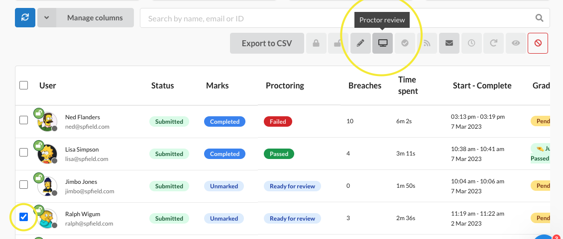 Select an attempt that's proctoring is **Ready for review using the check box on the left,** then use the control panel to open the proctoring review for that session.