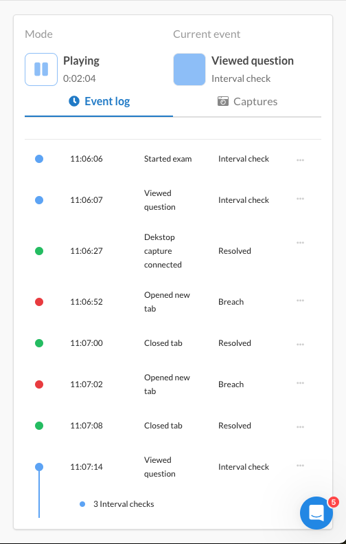 * 🔴 **Breaches** are detected upon a candidate breaking one of the configurable rules (opened new tab, plugged in external monitor, window lost focus, revoked sharing permissions)&#x20;