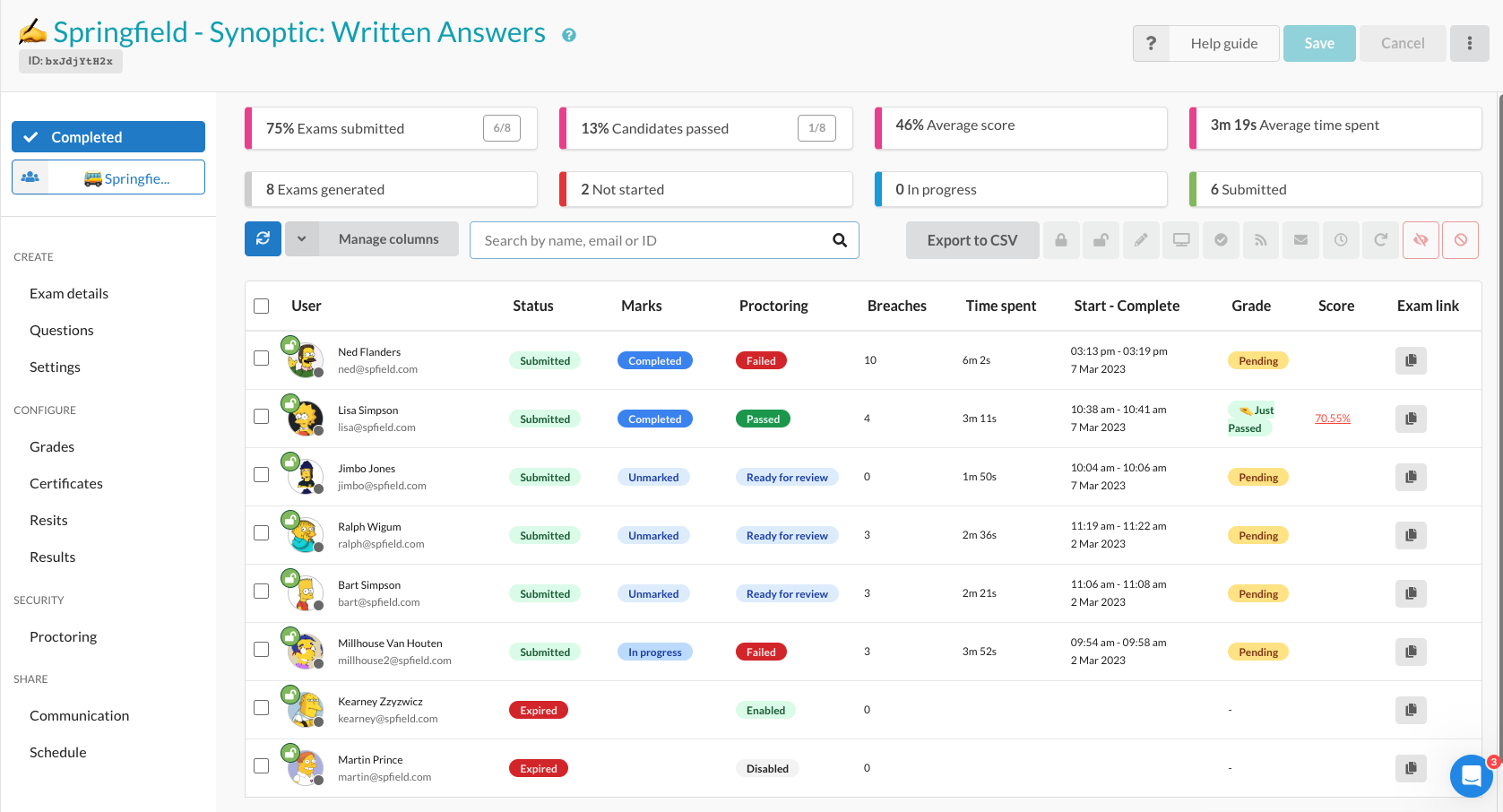 Once a Synoptic exam is finished it will be ready to be reviewed by and admin or other moderator (educator) for users in that exam group. To find exam attempts ready to review go to the Exam > Users page under the Manage section. Use the Proctoring status column to identify attempts.