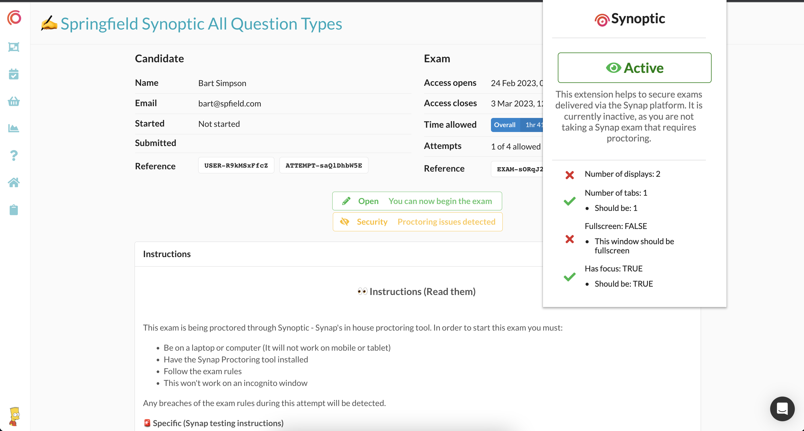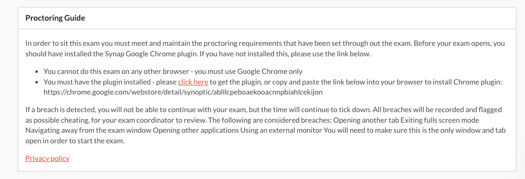In order to start the exam candidates must meet and maintain the proctoring conditions that have been set through out the exam. We recommend that before the exam opens your candidates install the Synoptic Google Chrome plugin. They will be shown a proctoring guide on their exam-hall page which is the last page before their exam.&#x20;