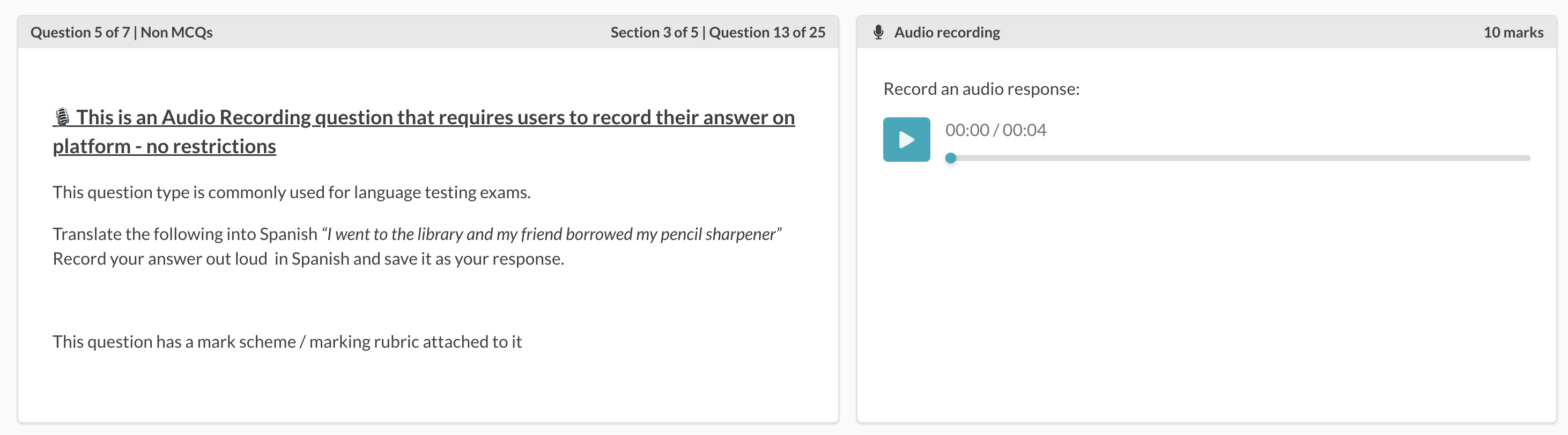 | **Audio Recording**     | Student must record themselves speaking using an audio recording widget in the answer box                                                                                                                                                                                                                                                                                                                                                                                               |