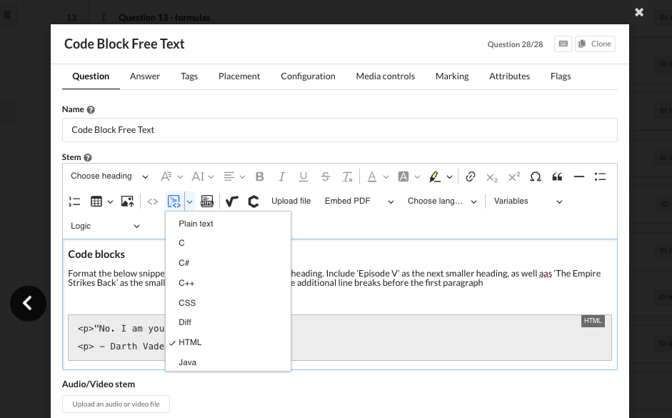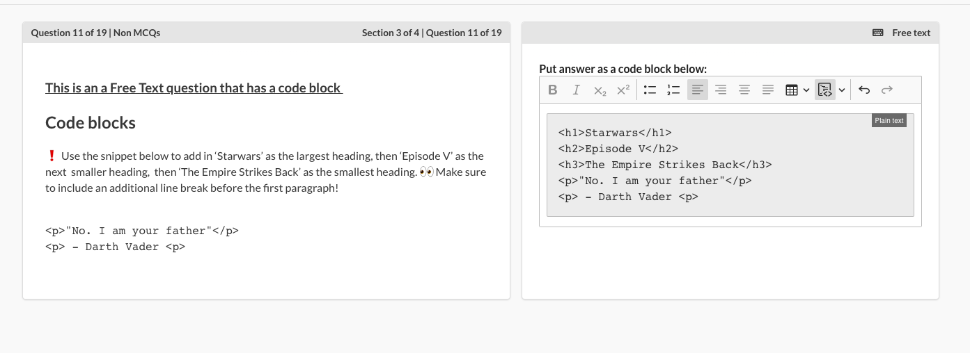 5. **Insert code block -** display text in a variety of different coding language formats (CSS, Java, Python etc) - available to students when answering a Free text question