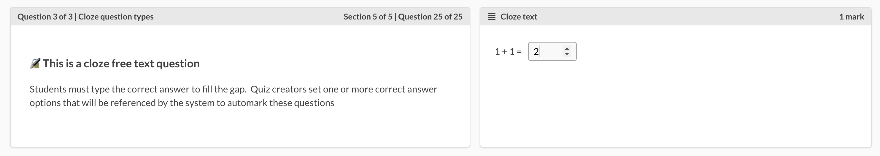 <figure><img src="https://3316915154-files.gitbook.io/~/files/v0/b/gitbook-x-prod.appspot.com/o/spaces%2F-MkgvUeCmTPeNouRxGPC%2Fuploads%2FnhT6JqmE6TuXkm6Mz5Wk%2FCloze%20free%20text%20question%20type.png?alt=media&#x26;token=3ba192eb-eee3-46dc-b7d1-a24104f5e923" alt=""><figcaption><p>An example of a cloze free text question</p></figcaption></figure>