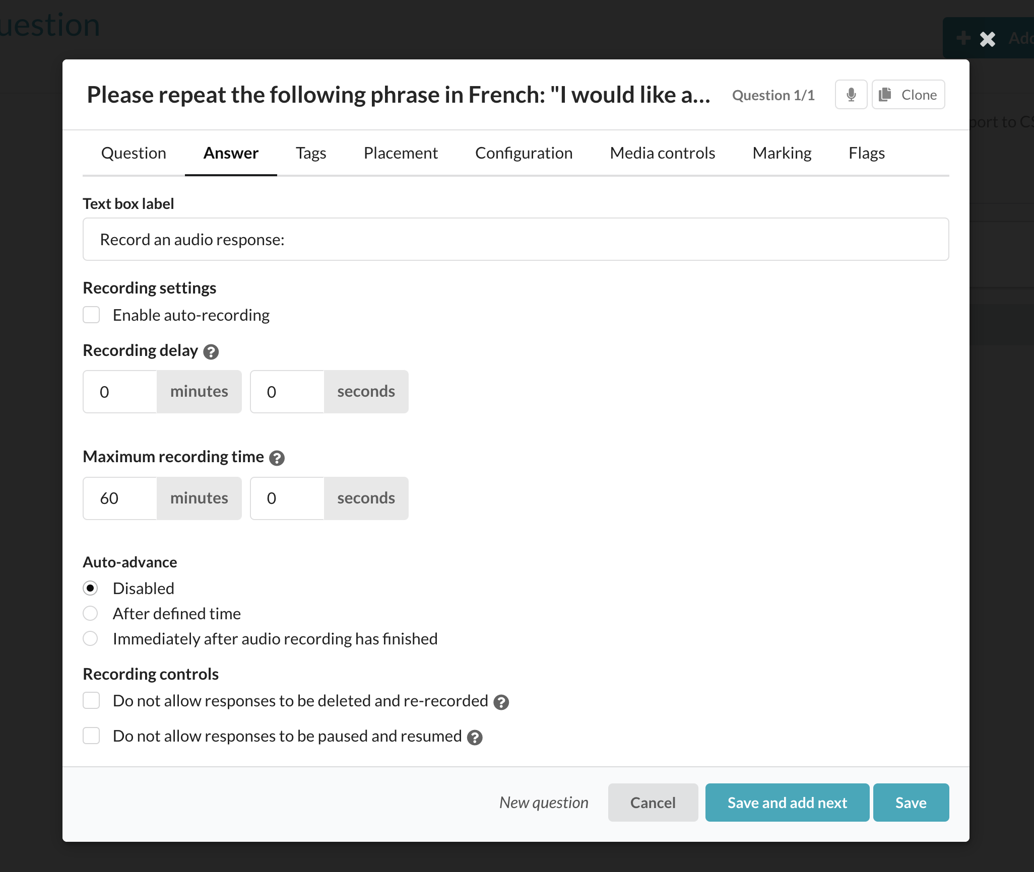 | Auto-advance           | <p>Disabled - The candidate will not be moved on to the next question automatically<br><br>After defined time - The candidate will be moved on to the next question after a defined amount of time<br><br>Immediately after audio recording has finished - The candidate will be moved on to the next question as soon as they have finished recording their audio</p> |