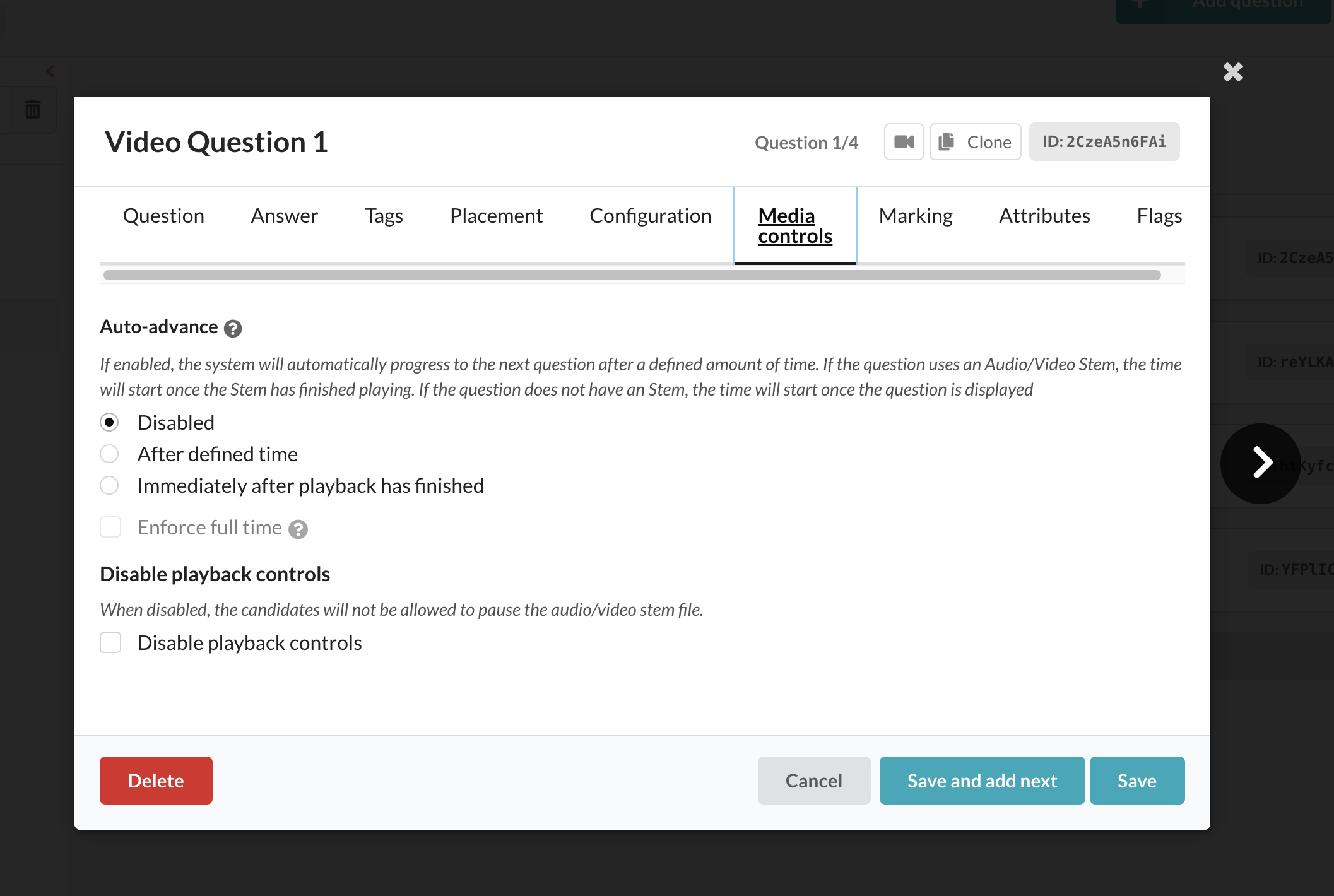 The auto-advance settings here apply to the question and the audio / video content in the stem