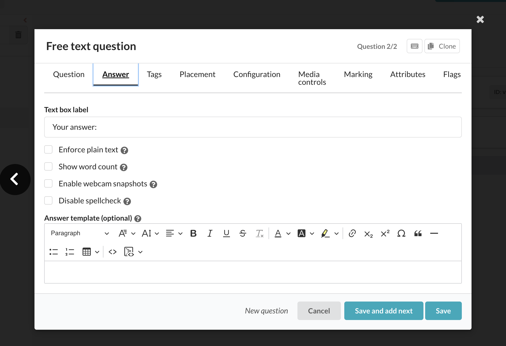 Free text questions allow your users to enter their own text responses to your questions.  They can format their text, use tables to display data and more.