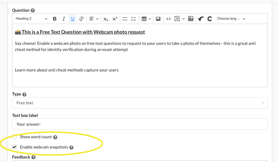 * Enable webcam snapshots - there will be an 'Open webcam' button below the text box.  On opening, users can take a webcam photo of themselves.  This can be used for verification purposes for example&#x20;