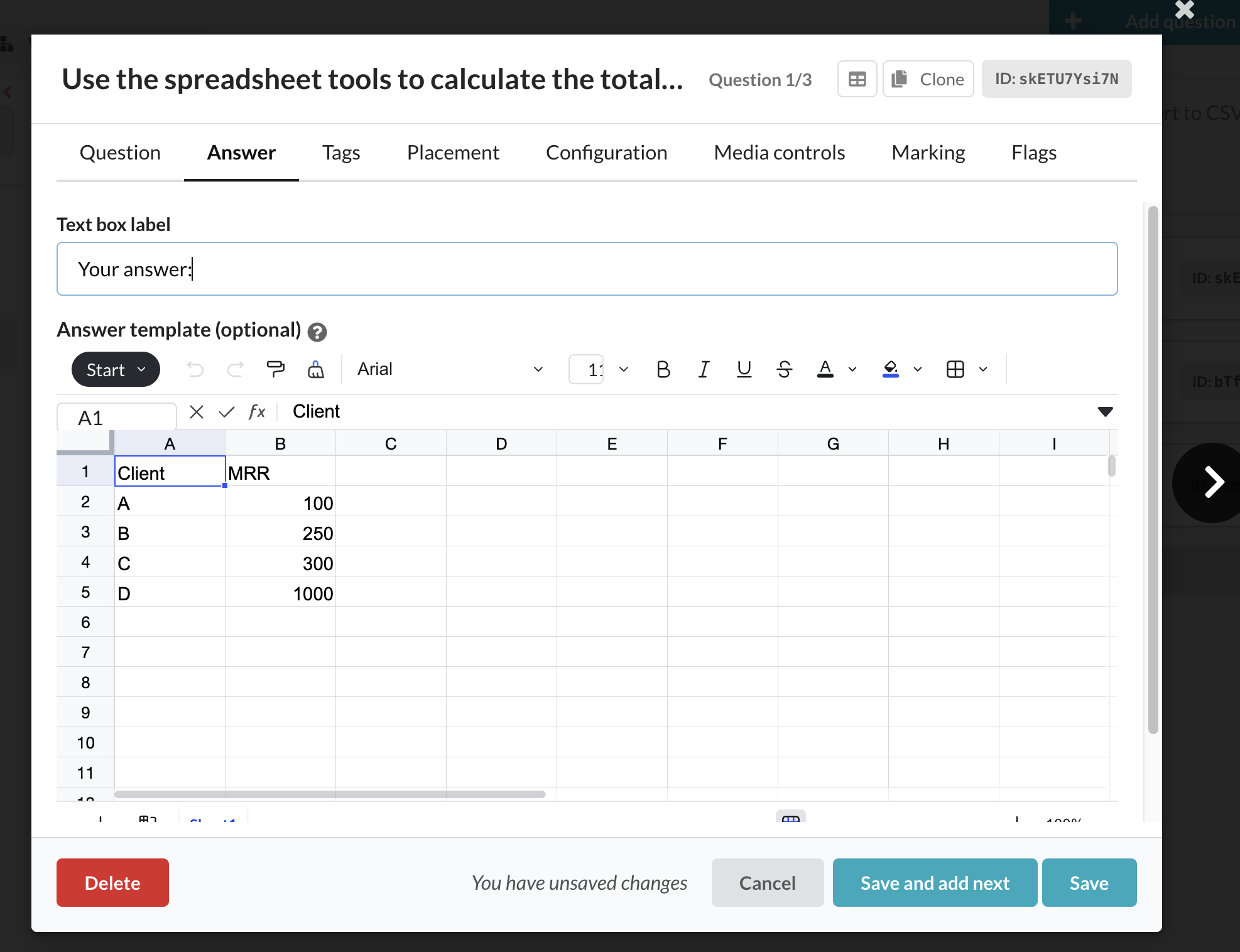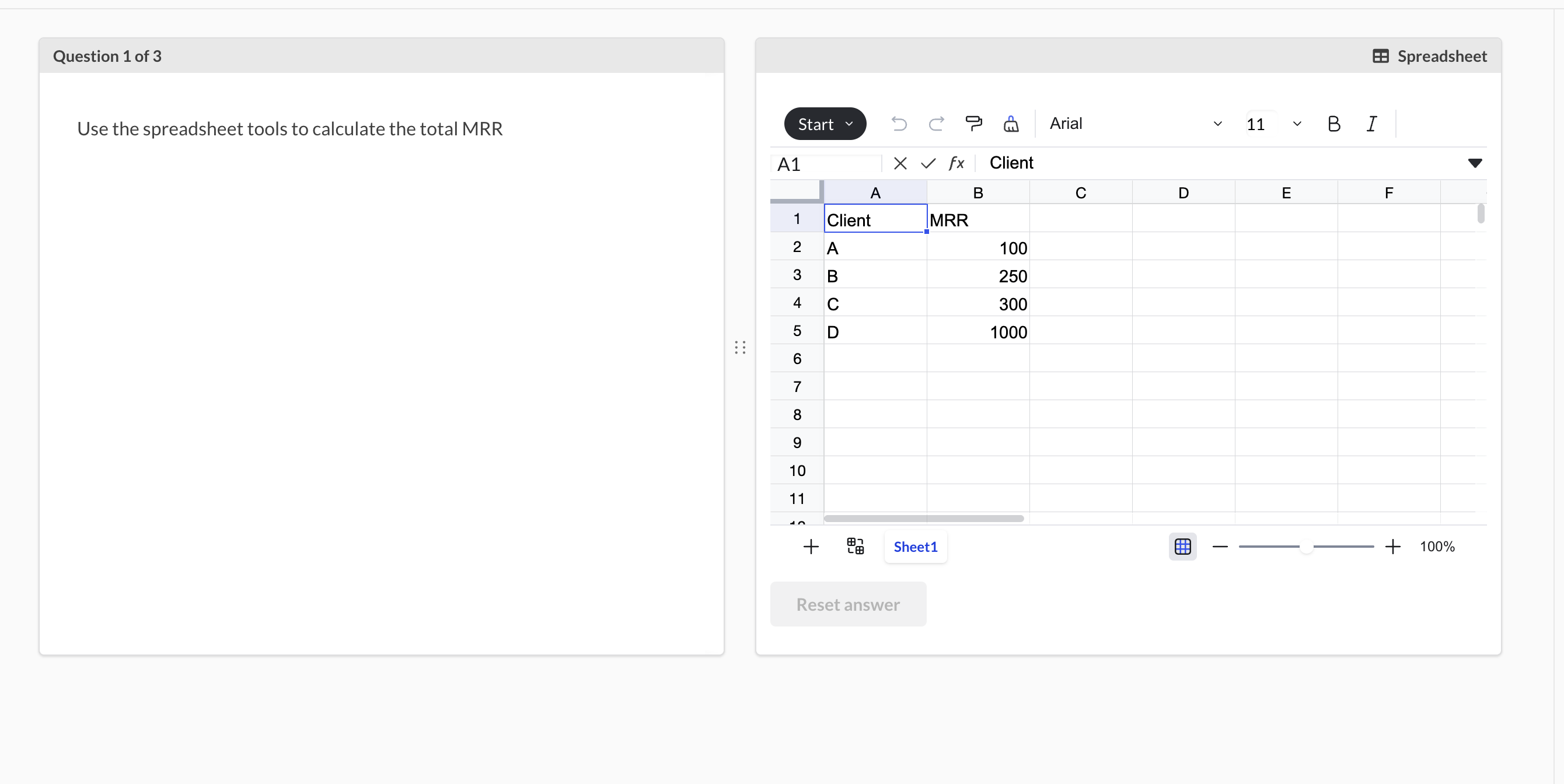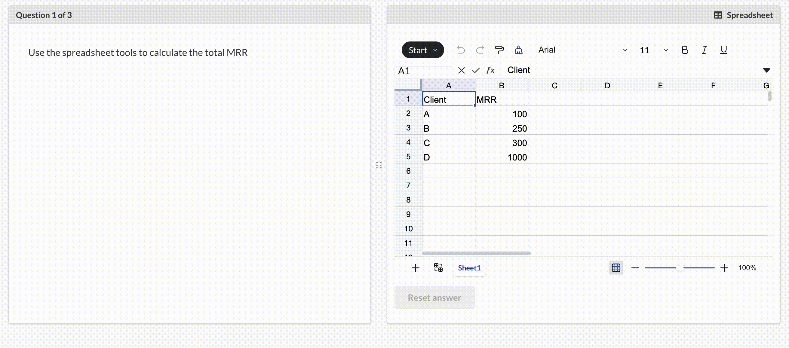 Spreadsheet questions allow you to gather user responses in the form of a spreadsheet embedded within the answer box.
