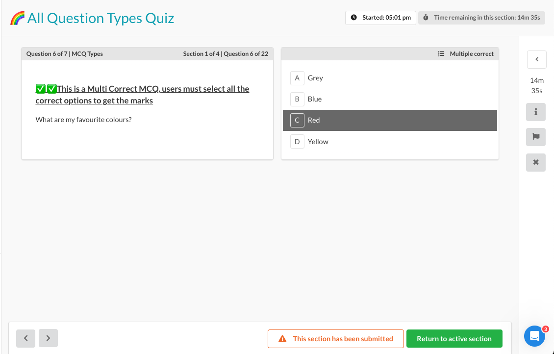 **Timer**: Set a default time for each section, else if a timer is enabled it can be inferred from individual questions&#x20;