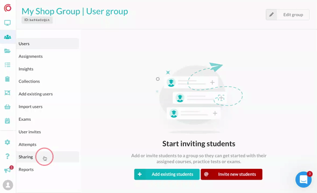 Create sharing links to a group which can be given to new or existing users and add them directly into a group. On any group page use the sub menu to select **Sharing**